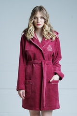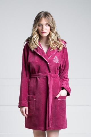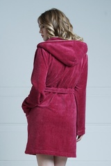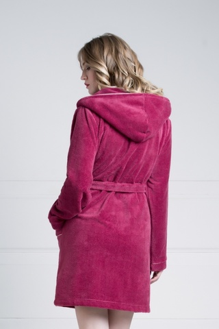 Уютный короткий халатик тёмно-розового цвета выполнен из мягкой велюровой ткани с натуральными волокнами бамбука. Отложной воротник, переходящий в глубокий капюшон, и манжеты халата отделаны тонким атласным кантом, прекрасно подчеркивающим основной цвет ткани. Удобные, глубокие накладные карманы добавляют модели комфорта. Длинный, съемный пояс на шлевках подчеркивает силуэт. Классический крой и длина подойдут женщинам, ценящим удобство и комфорт. В этом прекрасном халате безмятежный домашний отдых гарантирован. Состав: 60% бамбук, 25% хлопок, 15% полиэстер.