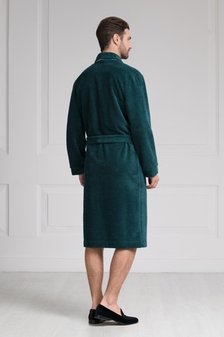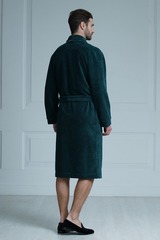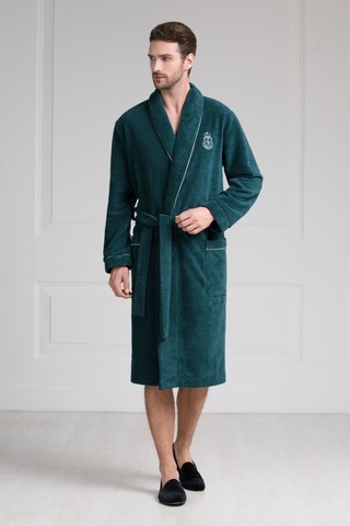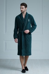 Классический мужской халат средней длины из мягкой плюшевой ткани стильного серо-зелёного цвета. В составе ткани натуральный бамбук, придающий ей особую мягкость и долговечность. Отложной воротник-шалька, манжеты халата, а также накладные карманы декорированы тонким атласным кантом контрастного цвета. Халат украшен на левой груди элегантным шевроном. Удобные, глубокие накладные карманы добавляют модели практичности. Длинный, съемный пояс подчеркивает силуэт. Классическая модель укороченной длины подойдет мужчинам, ценящим комфорт. Состав: 60% бамбук, 25% хлопок, 15% полиэстер.
