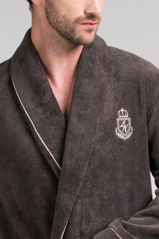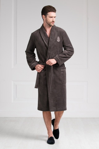 Классический мужской халат средней длины из мягкой плюшевой ткани стильного серо-зелёного цвета. В составе ткани натуральный бамбук, придающий ей особую мягкость и долговечность. Отложной воротник-шалька, манжеты халата, а также накладные карманы декорированы тонким атласным кантом контрастного цвета. Халат украшен на левой груди элегантным шевроном. Удобные, глубокие накладные карманы добавляют модели практичности. Длинный, съемный пояс подчеркивает силуэт. Классическая модель укороченной длины подойдет мужчинам, ценящим комфорт. Состав: 60% бамбук, 25% хлопок, 15% полиэстер.