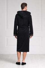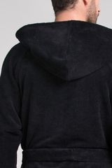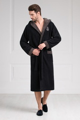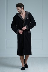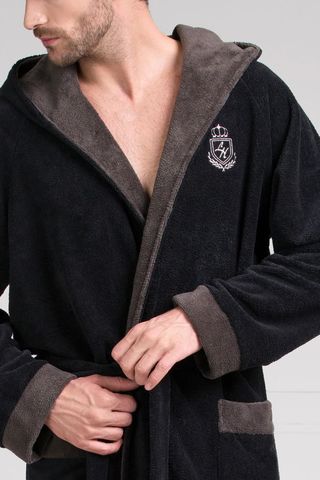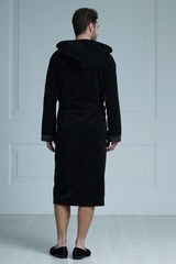 Теплый халат для мужчин средней длины из мягкой плюшевой ткани чёрного цвета. В составе ткани натуральный бамбук, придающий ей особую мягкость и долговечность. Халат на запахе с глубоким, удобным капюшоном. Манжеты халата, накладные карманы и подкладка капюшона из ткани более светлого оттенка. Халат украшен на левой груди элегантным шевроном. Удобные, глубокие накладные карманы добавляют модели практичности. Длинный, съемный пояс подчеркивает силуэт. В этой модели особенно комфортно после банных процедур. Состав: 60% бамбук, 25% хлопок, 15% полиэстер.
