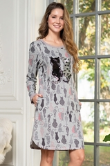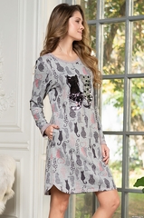 Домашнее платье Mia-Mella длиной до колен с длинными рукавами выполнен из принтованного мягкого серого меланжа. Спереди на платье эффектная блестящая аппликация в виде кошек, выполненная в технике "би-колор". Состав 35% акрил, 35% полиэстер, 25% вискоза, 5% спандекс