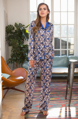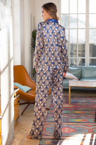 Комплект домашний женский Миа-Миа из принтованного сатина. Состоит из жакета и длинных брюк. Жакет с V-образным вырезом на пуговицах, с длинными втачными рукавами. Воротник выполнен из однотонного сатина. Брюки прямые с карманами в боковых швах. Пояс брюк на резинке.