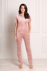 Прекрасный комплект из мягкой велюровой ткани нежного пудрового цвета. Комплект состоит из укороченной курточки на молнии и брючек. Курточка с короткими рукавами и глубоким капюшоном, который продублирован подкладкой из атласной ткани в тон с цветочным рисунком и дополнен регулируемыми атласными завязками. Прорезные карманы добавляют комфорта. Удобные брючки на резинке с кулиской по талии и боковыми карманами, отделанными атласным кантом, подчеркнут красоту фигуры. Характеристики: Длина рукава от плечевого шва или плеча (см): 24 Длина по спинке (см): 59 Степень плотности ткани: Средняя плотность Растяжимость ткани: Не тянется Состав:бамбук 60%, хлопок 25%, полиэстер 15%