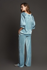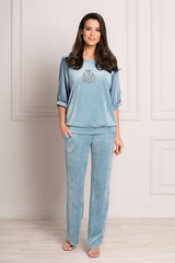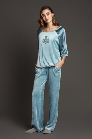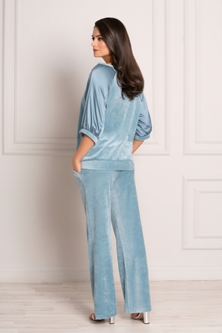 Элегантный костюм из мягкой велюровой ткани серо-голубого цвета. Курточка свободного кроя с рукавами-реглан средней длины, выполненными из мягкой ткани в тон с легким блеском, украшена спереди красивым рисунком, выложенным из мелких золотистых страз. Вырез-лодочка подчеркивает красоту шеи и плеч. По низу курточки проходит широкая планка, моделирующая силуэт. Удобные, прямые брючки свободного покроя с резинкой по талии дополняют глубокие боковые карманы. Красивый костюм подчеркнет вашу женственность и стиль. Характеристики: Длина рукава от плечевого шва или плеча (см): 43 Длина по спинке (см): 60 Степень плотности ткани: Средняя плотность Растяжимость ткани: Не тянется Состав:бамбук 60%, хлопок 25%, полиэстер 15%
