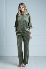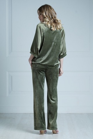 Элегантный костюм из мягкой велюровой ткани красивого оливкового цвета. Курточка свободного кроя с рукавами-реглан средней длины, выполненными из мягкой ткани в тон с легким блеском, украшена спереди красивым рисунком, выложенным из мелких золотистых страз. Вырез-лодочка подчеркивает красоту шеи и плеч. По низу курточки проходит широкая планка, моделирующая силуэт. Удобные, прямые брючки свободного покроя с резинкой по талии дополняют глубокие боковые карманы. Красивый костюм подчеркнет вашу женственность и стиль. Характеристики: