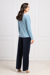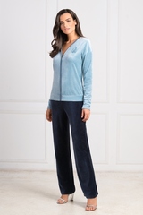 Контрастное сочетание свежегосеро-голубого и глубокого синего выглядит всегда эффектно! Этот элегантный костюм состоит из двух предметов. Курточка выполнена из бархатистой ткани с волокнами бамбука, который придает ей особую мягкость и долговечность. V-образный вырез горловины делает акцент на красивой шее. Слева курточка декорирована красивым рисунком из мелких страз. Верх застегивается на золотую застежку-молнию, по низу проходит широкая планка для комфортной носки. Прямые брючки с боковыми втачными карманами на талии на удобной, плоской резинке. Состав: бамбук 60%, хлопок 25%, полиэстер 15%
