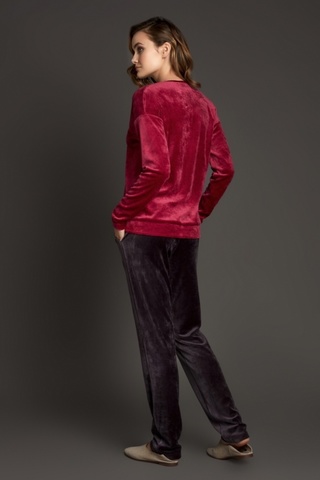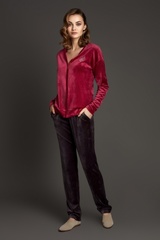 Контрастное сочетание насыщенного красного цвета и глубокого шоколадного выглядит всегда эффектно! Этот элегантный костюм состоит из двух предметов. Курточка выполнена из бархатистой ткани с волокнами бамбука, который придает ей особую мягкость и долговечность. V-образный вырез горловины делает акцент на красивой шее. Слева курточка декорирована красивым рисунком из мелких страз. Верх застегивается на золотую застежку-молнию, по низу проходит широкая планка для комфортной носки. Прямые брючки с боковыми втачными карманами на талии на удобной, плоской резинке. Характеристики: Длина рукава от плечевого шва или плеча (см): 60 Длина по спинке (см): 64 Степень плотности ткани: Средняя плотность Растяжимость ткани: Слабо тянется Состав: бамбук 60%, хлопок 25%, полиэстер 15%