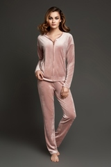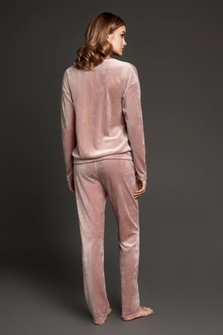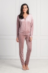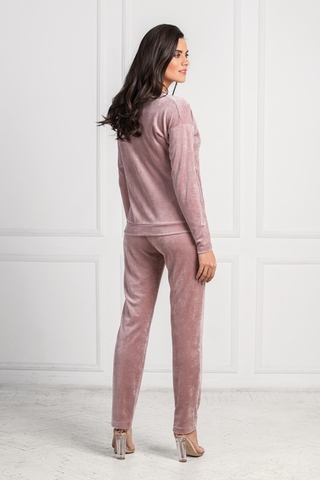 Красивый велюровый костюм для дома и отдыха выполнен из мягкой ткани с добавлением бамбука. Комплект спокойного розового цвета оттенка «темная пудра» состоит из двух деталей. Верх - курточка классического кроя с длинными рукавами. Плавный V-образный вырез горловины продолжается застежкой-молнией, окантованной атласной тесьмой в тон основной ткани. Два прорезных кармана декорированы атласом канта и элегантным украшением. По низу курточки проходит удобная планка. Низ – классические брюки прямого покроя на плоской резинке по талии. Характеристики: Длина рукава от плечевого шва или плеча (см): 72 Длина по спинке (см): 60 Степень плотности ткани: Средняя плотность Растяжимость ткани: Не тянется Состав: бамбук 60%, хлопок 25%, полиэстер 15%
