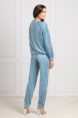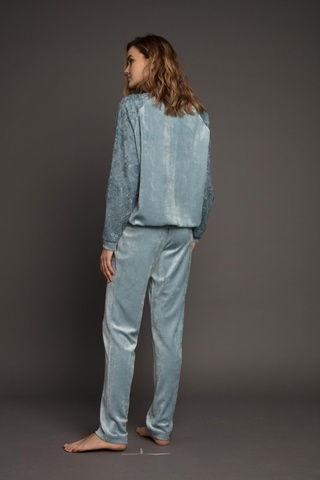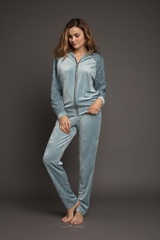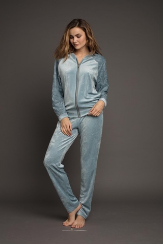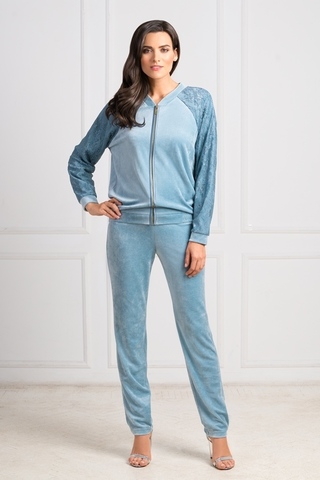 Прекрасный комплект из мягкой велюровой ткани с натуральным бамбуком нежного серо-голубого цвета. Комплект состоит из укороченной курточки на молнии и брючек. Курточка без воротника с V-образным вырезом горловины и длинными рукавами-реглан, которые продублированы красивой кружевной тканью с узором в тон основной ткани костюма. Нежное кружево придает женственность модели. На рукавах манжеты, по низу курточки планка с резинкой. В комплекте удобные прямые брючки на плоской резинке по талии, подчеркивающие красоту фигуры. Характеристики: Длина рукава от плечевого шва или плеча (см): 66 Длина по спинке (см): 62 Степень плотности ткани: Средняя плотность Растяжимость ткани: Хорошо тянется Состав: бамбук 60%, хлопок 25%, полиэстер 15%