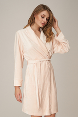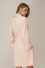 Удобный, короткий домашний халатик выполнен из мягкой, бархатистой ткани красивого кремового цвета. Добавление натурального бамбука делает ткань особенно мягкой, а также гипоаллергенной и устойчивой к стиркам. Модель трапециевидного кроя длиной до колена с отложным воротником и длинными рукавами с манжетами, которые можно подвернуть. Удобные, глубокие боковые карманы добавляют модели комфорта. Длинный, съемный пояс на шлевках подчеркивает силуэт. Классический крой и длина подойдут женщинам, ценящим элегантность, уют и комфорт. В этом прекрасном халате Вы будете выглядеть особенно женственно. Состав: 60% бамбук,25% х/б,15% п/э