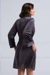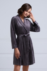 Удобный, короткий домашний халатик выполнен из мягкой, бархатистой ткани красивого коричневого цвета. Добавление натурального бамбука делает ткань особенно мягкой, а также гипоаллергенной и устойчивой к стиркам. Модель трапециевидного кроя длиной до колена с отложным воротником и длинными рукавами с манжетами, которые можно подвернуть. Удобные, глубокие боковые карманы добавляют модели комфорта. Длинный, съемный пояс на шлевках подчеркивает силуэт. Классический крой и длина подойдут женщинам, ценящим элегантность, уют и комфорт. В этом прекрасном халате Вы будете выглядеть особенно женственно. Характеристики: