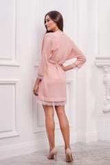 Романтичный короткий халатик свободного кроя в нежных розовых тонах. Модель выполнена из мягкого акрила с узором «зиг-заг» и легким блеском. Структурность ткани оттеняет легкое кружево с ажурными краями, которым украшены небольшие рукава и подол модели. Вырез горловины и края халата отделаны кантом из атласной ткани, совпадающей с цветом модели. Съемный пояс на шлевках так же выполнен из атласной ткани. Сочетание разных фактур и оттенков цвета создает прекрасный образ, подчеркивающий вашу нежность! Характеристики: Длина рукава от плечевого шва или плеча (см): 60 Длина по спинке (см): 95 Вид застежки: Завязка Тип карманов: Втачные Пояс: В комплекте Состав: акрил 84%, полиэстер 16%