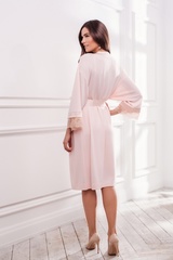 Элегантный халат-кимоно на запахе из легкой трикотажной ткани высокого качества персикового цвета. Халат удобной длины до колена, свободного кроя для комфортной носки. Свободные рукава длиной 3/4 декорированы широкими манжетами из нежного кружева с фантазийными узорами и ажурными краями. Халат вдоль полочек и манжет рукавов отделан атласными вставками в тон. В комплекте съемный длинный пояс из атласной ткани на шлевках, подчёркивающий талию и фигуру. Красивый халат с нежным декором, который подчеркнет вашу женственность. Характеристики: Длина рукава от плечевого шва или плеча (см): 54 Длина по спинке (см): 100 Степень плотности ткани: Ткань тонкая Растяжимость ткани: Тянется слабо Пояс: В комплекте Вырез горловины: V-образный Тип рукавов: Кимоно Состав: вискоза 65%, полиэстер 35%