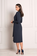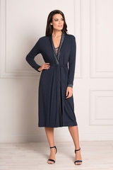 Легкий домашний халат универсальной длины до щиколотки, на запахе из приятной, натуральной вискозы синего цвета с меланжевым узором. Комфортная длина модели и свободный силуэт созданы для отдыха и красоты. Простой, но при этом элегантный дизайн халата подчеркнут акцентами из атласной, принтованной ткани синего цвета, которой украшены края полочек, отложной воротник и манжеты классических рукавов. Длинный съемный пояс на шлевках подчеркнет ваш силуэт. Легкость и нежность ткани и глубокий цвет создают прекрасное настроение. Характеристики: Длина рукава от плечевого шва или плеча (см): 55 Длина по спинке (см): 110 Степень плотности ткани: Ткань тонкая Растяжимость ткани: Хорошо тянется