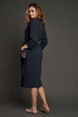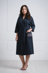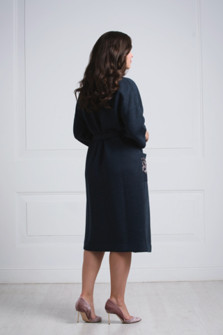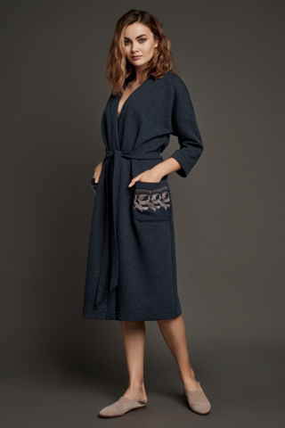 Стильный домашний халат интересного синего цвета меланж. Модель выполнена из плотной, смесовой ткани с фактурным рисунком в ромб. Халат на запАхе, свободного кроя, комфортной длины чуть ниже колен. V-образный вырез горловины и полочки отделаны кантом из основной ткани. Свободные рукава со спущенной линией плеча длиной 7/8 декоративно отстрочены. Внимание привлекают накладные карманы, которые украшают вставки из изысканного кружева с золотистым узором. Длинный, съемный пояс на шлевках подчеркнет Ваш силуэт.