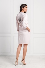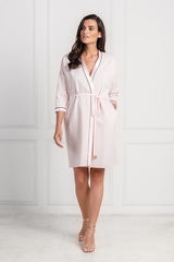 Прелестный домашний халатик выполнен из мягкой смесовой ткани с добавлением хлопка красивого персикового цвета. Халат длиной выше колена, на запахе, с V-образным вырезом. Модель декорирована контрастной ажурной тесьмой и атласным кантом в тон основной ткани вдоль краев полочек и манжетов рукавов длиной 3/4. В боковых швах халата удобные карманы. Тонкий, атласный поясок с бусинами на концах акцентирует внимание на линии талии. Особое очарование модели придает кружевная вставка на спинке, украшенная подвеской с жемчужинками. Приятная ткань и эффектный декор прекрасно сочетаются в этой модели, подчеркивая Ваш изысканный вкус.