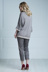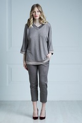 Красивый домашний комплект в бежевом цвете привлекает эффектным сочетанием различных фактур тканей и узоров. Удлиненный джемпер свободного кроя выполнен из мягкой, трикотажной ткани. V-образный вырез горловины декорирован тканью с геометрическим узором. Цельнокроенные рукава длиной 7/8 и нижний край отделаны фактурной тканью и тонким атласным кантом коричневого цвета. В боковых швах небольшие разрезы. В комплекте также удобные укороченные брючки зауженного кроя, выполненные из ткани с геометрическим принтом. Состав: Джемпер: 85% вискоза,15% полиэстер; брюки: 65% вискоза, 35%полиэстер.
