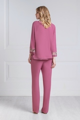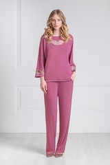 Женственная пижама классического силуэта выполнена из легкой вискозной ткани с эластаном красивого темно-розового цвета. Верх – топ свободного силуэта с рукавами-реглан длиной 7/8. Округлый вырез горловины и нижний край окантованы атласной тканью в тон основной ткани. Манжеты рукавов и верхняя часть полочки украшены вставками из полупрозрачной микросетки с шикарной вышивкой с цветочным узором. Низ – прямые, широкие брючки на плоской резинке по талии. В боковых швах брюк комфортные карманы. Сочетание цвета и декора делает модель особенно привлекательной. Характеристики: Ширина резинки(см) 3 Длина рукава от плечевого шва или плеча (см) 54 Длина по спинке (см) 54 Тип карманов Прорезные Длина по внутреннему шву-брюки (шорты) (см) 74 Степень плотности ткани Ткань тонкая Растяжимость ткани Хорошо тянется Особенность ткани Кружево просвечивается Комплектация Свитшот + брюки Вырез горловины Округлый Тип рукавов 7/8 Состав: 95% вискоза, 5% спандекс.