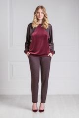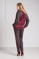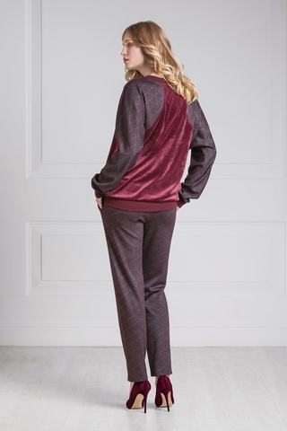 Красивый костюм для дома и отдыха выполнен из мягкой, смесовой ткани бордового цвета с оригинальным геометрическим узором. Джемпер свободного силуэта с округлым вырезом горловины выполнен из комбинированной ткани – основной с узором в сочетании с однотонной велюровой тканью бордового цвета. Манжеты рукавов реглан и вырез горловины выполнены из эластичного трикотажа. Классические брючки зауженного кроя дополнены удобными боковыми карманами. Эффектная ткань и модный цвет создают яркий, привлекательный образ. Характеристики: Длина рукава от плечевого шва или плеча (см) 75 Длина по спинке (см) 65 Длина по внутреннему шву-брюки (шорты) (см) 78 Растяжимость ткани Не тянется Комплектация Рубашка+брюки Вырез горловины Полукруглый К-во карманов 2 Состав: 65% вискоза, 35% полиэстер.