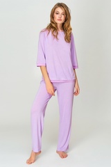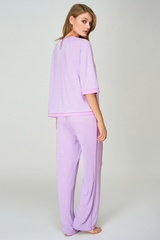 Женственная пижама классического силуэта выполнена из легкой смесовой ткани с вискозой красивого цвета лаванды. Верх – свитшот свободного силуэта с рукавами-реглан длиной 3/4. Округлый вырез горловины, края рукавов и нижний край окантованы атласной тканью в тон основной ткани. Спинка украшена оригинальным вырезом-каплей. Низ – прямые, широкие брючки комфортного объема на плоской резинке по талии. Модель простого кроя без лишних деталей эффектно смотрится за счет нежного цвета и декора. Романтичный цвет подчеркивает вашу красоту и очарование. Характеристики: Длина рукава от плечевого шва или плеча (см) 50 Длина по спинке (см) 56 Тип карманов Карманов нет Длина по внутреннему шву-брюки (шорты) (см) 76 Степень плотности ткани Ткань тонкая Растяжимость ткани Хорошо тянется Комплектация Свитшот + брюки Вырез горловины Округлый Тип рукавов В три четверти Состав: 70% п/э, 30 % вискоза.