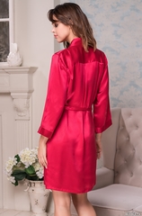 Короткий классический халат Mia-Amore с длинным рукавом выполнен из натурального шелка. На верхней части полочки расположен накладной карман с вышивной монограммой бренда. В боковых швах халата выполнены карманы. Халат запахивается на пояс. Швы халата обработаны закрытым швом. Состав 100% натуральный шелк