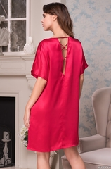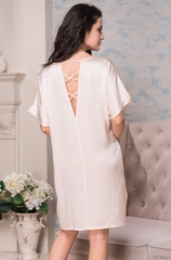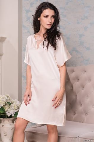 Туника Mia-Amore длиной чуть выше колена с рукавом длиной 3/4, выполнена из натурального шелка. V-образный вырез украшен декором с кристаллами Swarovski. На спинке выполнен вырез с имитацией шнуровки. В боковых швах обработаны карманы и расположены разрезы. Швы туники обработаны закрытым швом Состав 100% натуральный шелк