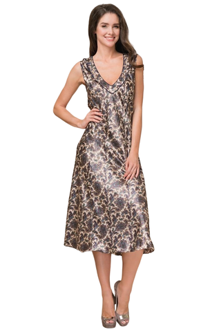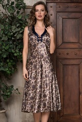 Длинная сорочка Mia-Amore на широких бретелях выполнена из принтованного смесового шелка. Фигурный вырез выполнен из однотонного шелка. По центру оригинальная застежка под золото. Рельефные швы подчеркивают изгибы фигуры. Состав 70% натуральный шелк, 25% полиэстер, 5% эластан