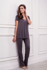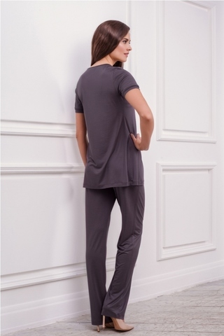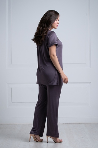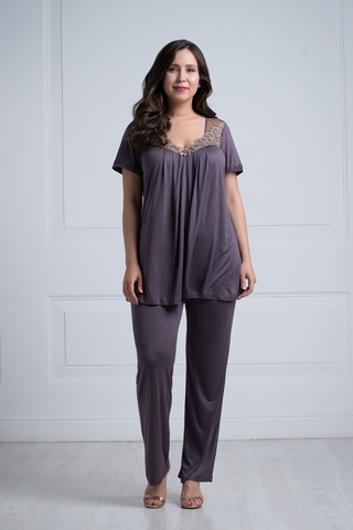 Элегантная пижама серо-коричневого цвета выполнена из натуральной вискозы. Особенность модели – фигурная вставка в верхней части топа, созданная из тончайшей полупрозрачной ткани с красивой филигранной цветочной вышивкой и украшенная маленьким бантиком с подвеской в центре. Короткие рукава оформлены тонким атласным кантом. Красивый, свободный крой топа с мягкими складками от декольте не облегает, скрывая легкие недостатки фигуры. Низ пижамы – классические прямые брючки на плоской резинке по талии. Характеристики: Длина по спинке (см) 72 Длина по внутреннему шву-брюки (шорты) (см) 82 Степень плотности ткани: Ткань легкая Растяжимость ткани: Хорошо тянется Состав: 100% микромодал