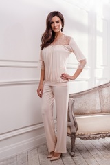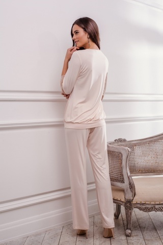 Элегантный комплект приятного нежно-бежевого цвета выполнен из легкой, натуральной ткани с бамбуком, придающим модели особую мягкость и долговечность. Верх - топ свободного силуэта с рукавами длиной 3/4 и планкой по низу. Особую нежность модели придают вставки из роскошного, полупрозрачного кружева, которые украшают рукава и верхнюю часть топа. От области декольте, украшенной бантиком, заложены встречные складки, мягко ниспадающие вниз, по низу так же проходит легкая драпировка. Низ комплекта – классические длинные брючки прямого кроя с плоской резинкой на талии. Характеристики: Длина по спинке (см) 42 Длина по внутреннему шву-брюки (шорты) (см) 68 Степень плотности ткани: Ткань легкая Растяжимость ткани: Хорошо тянется Состав: 93,5% бамбук, 6,5% спандекс