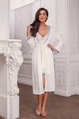 Роскошный халат на запахе элегантной длины чуть ниже колен выполнен из легкой вискозы молочного цвета. Особую нежность халату придают красиво декорированные атласными вставками в тон и полупрозрачным кружевом приятного сиренево-голубого оттенка края рукавов и V-образный вырез горловины. Атласной тканью также продублирован съемный пояс на шлевках. Атласные вставки вдоль полочек в тон основной ткани красиво подчеркивают нежность модели и цвета. Создайте свой особенный образ в этом прекрасном халате. Характеристики: Длина рукава от плечевого шва или плеча (см): 60 Длина по спинке (см): 115 Вид застежки: Завязка Растяжимость ткани: Хорошо тянется Пояс: В комплекте Состав: микромодал (вискоза) 94%, эластан 6%
