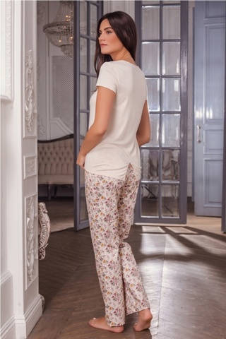Легкая пижама в непринужденном стиле выполнена из натуральных материалов. Верх – топ молочного цвета свободного кроя с короткими рукавами. Округлый вырез горловины окантован тонкой бейкой. Нижний край топа ассиметричной длины, с удлиненной спинкой, украшенной также интересным треугольным разрезом. Низ пижамы – прямые брючки из 100% хлопка с цветочным принтом. Брючки комфортной длины и ширины дополнены боковыми карманами, отделанными тесьмой. Пояс с комфортной плоской резинкой украшен нежным бантиком. Состав: Футболка: 95% вискоза, 5% спандекс; брюки: 100% хлопок.