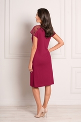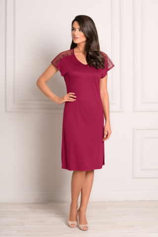 Женственная сорочка длиной до колена свободного силуэта выполнена из легкой натуральной ткани эффектного рубинового цвета. Глубокий V-образный вырез в области декольте окантован атласной тканью и украшен милым бантиком с красивой подвеской. Спинка украшена небольшим вырезом-капелькой. Сорочка выполнена с цельнокроенными короткими рукавами. Область плеча и верхняя часть рукавов, а также спинка украшены красивыми кружевными вставками с изысканным узором. В боковых швах сорочки небольшие разрезы для комфортного движения. Характеристики: Длина рукава от плечевого шва или плеча (см): 24 Длина по спинке (см): 98 Степень плотности ткани: Ткань тонкая Растяжимость ткани : Тянется слабо Состав: микромодал 100%.