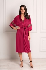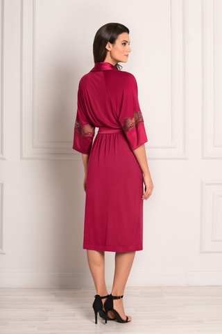 Женственная модель – халат универсальной длины до колена на запахе из легкой, натуральной ткани (вискозы) эффектного бордового цвета. Комфортная длина модели и свободный силуэт созданы для отдыха и красоты. Элегантный дизайн халата подчеркнут акцентами из атласной ткани и тончайшего кружева с цветочным узором, которым украшены широкие манжеты свободных рукавов длиной 3/4. Длинный съемный пояс на шлевках отлично подчеркнет ваш стройный силуэт. Легкость ткани и нежность кружева создают удивительную атмосферу и романтическое настроение.
