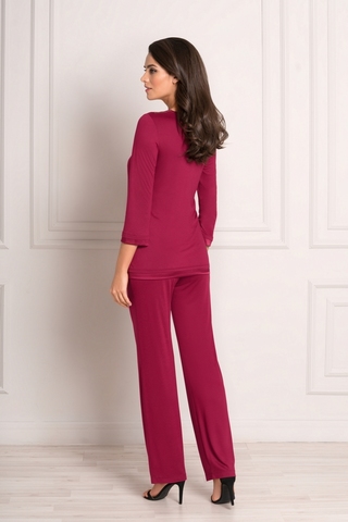 Элегантный комплект насыщенного бордового цвета выполнен из легкой, 100% натуральной ткани, приятной телу. Верх - топ свободного силуэта с рукавами длиной 3/4. Края рукавов и низ топа отделаны атласным кантом в тон основной ткани. Особую нежность модели придают вставки из роскошного, полупрозрачного кружева, которые украшают V-образный вырез горловины. Область декольте украшена небольшим бантиком. Низ комплекта – классические длинные брючки прямого кроя с плоской резинкой на талии, комфортные в носке. Характеристики: Длина рукава от плечевого шва или плеча (см) 44 Длина по спинке (см) 58 Длина по внутреннему шву-брюки (шорты) (см) 74 Степень плотности ткани Ткань тонкая Растяжимость ткани Тянется слабо Состав: 100% микромодал