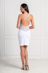 Роскошная сорочка приталенного силуэта выполнена из мягкой вискозы белого цвета. Тонкие атласные бретели, переходящие в кант по верхнему краю глубокого V-образного выреза спинки, перекрещиваются на спинке и регулируются по длине. Кружевной лиф, игриво прикрывающий грудь, нежно подчеркивает стройность фигуры и плавно продолжается на спинке сорочки. Ажурное кружево – изюминка модели, эффектный акцент на вашей красоте. Внимание к декольте привлекает бантик с небольшой подвеской. Низ сорочки отделан атласным кантом в тон модели. Характеристики: Длина по спинке (см): 50 Степень плотности ткани: Ткань тонкая Растяжимость ткани: Тянется слабо Состав: вискоза 95%, спандекс 5%