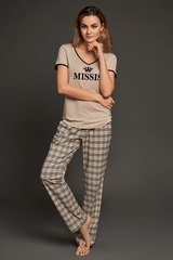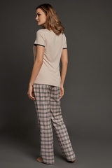 Стильная пижама из натуральных тканей в приятных бежевых тонах состоит из двух деталей. Верх – топ свободного силуэта из легкой, приятной телу вискозы с эластаном, украшенный спереди крупным принтом и надписью. V-образный вырез горловины и короткие рукава обработаны тонким кантом контрастного черного цвета. Низ – хлопковые брючки в бежево-черную клетку на широкой резинке. Брючки прямого кроя, комфортной ширины, дополнены двумя удобными прорезными карманами, отделанными черным кантом. Боковые швы так же декоративно отделаны кантом, как карманы. Характеристики: Длина по спинке (см) 60 Длина по внутреннему шву-брюки (шорты) (см) 78 Степень плотности ткани: Ткань тонкая Растяжимость ткани: Слабо тянется Состав: Футболка: 95% вискоза, 5% спандекс; брюки: 95% хлопок, 5% эластан