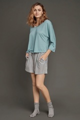Стильный комплект с шортами из натуральных тканей в приятных пастельных тонах состоит из двух деталей. Верх – укороченный топ свободного силуэта с цельнокроенными рукавами, выполненный из легкой, приятной телу смесовой ткани с приятным структурным рисунком. V-образный вырез горловины обработан тонким атласным кантом и украшен рядом пуговок. В боковых швах топа небольшие разрезы. Низ – хлопковые шортики в бежево-синюю полоску на широкой резинке по талии. Шортики прямого кроя, комфортной длины, дополнены двумя удобными прорезными карманами, отделанными тонким кантом. Характеристики: Длина по спинке (см) 60 Длина по внутреннему шву-брюки (шорты) (см) 12 Степень плотности ткани: Ткань легкая Растяжимость ткани: Слабо тянется Состав: Футболка: 85% вискоза, 15% полиэстер; шорты 100% хлопок