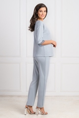 Приятный домашний костюм из мягкой смесовой ткани с легким структурным рисунком «ёлочка» и изысканным кружевным декором. Верх – топ свободного кроя с рукавами удобной длины. Округлый вырез горловины окантован атласной бейкой. Нижний край рукавов украшен кружевными манжетами. Перед топа оригинально дополнен деталью из роскошного полупрозрачного кружева с эффектным цветочным узором, которое прекрасно дополняет основную ткань. Низ костюма – прямые брючки, украшенные кантом в боковых швах. В поясе комфортная плоская резинка. Характеристики: Длина рукава от плечевого шва или плеча (см): 50 Длина по спинке (см): 59 Степень плотности ткани: Средняя плотность Растяжимость ткани: Хорошо тянется Состав: вискоза 85%, полиэстер 15%