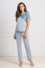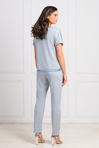 Красивый домашний костюм красивого серо-голубого цвета с кружевным декором выполнен из мягкой смесовой ткани с легким структурным рисунком «ёлочка». Джемпер свободного кроя с округлым вырезом горловины, окантованным атласной тканью и украшенным на спинке стильной подвеской. Верхняя часть джемпера и короткие цельнокроенные рукава спереди красиво декорированы полупрозрачным кружевом в тон основной ткани. По низу джемпер украшен атласным кантом. Прямые, широкие брючки на резинке украшены вдоль боковых швов тонким кантом. Характеристики: Длина рукава от плечевого шва или плеча (см): 26 Длина по спинке (см): 62 Степень плотности ткани: Ткань тонкая Растяжимость ткани: Хорошо тянется Состав: вискоза 85%, полиэстер 15%
