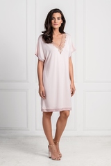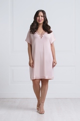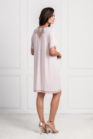 Женственная, нежная сорочка свободного кроя с красивым кружевным декором. Модель выполнена из легкой, мягко струящейся вискозы высокого качества светло-бежевого цвета. Лиф с глубоким V-образным вырезом украшен стильной подвеской и шикарной кружевной вставкой с рельефной цветочной вышивкой, которая привлекает взгляд и делает образ особенно эффектным. Спинка так же украшена кружевной аппликацией. Сорочка с короткими, цельнокроенными рукавами. Подол и рукава отделаны атласным кантом в тон. Свободный крой и сочетание цвета и кружева гармонично подчеркивают красоту фигуры.