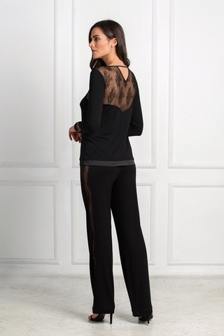 Роскошный домашний комплект черного цвета выполнен из легкой, натуральной вискозы с эластаном в сочетании с кружевным декором. Верх - топ свободного силуэта с длинными рукавами. V-образные вырезы спереди и на спинке и низ топа окантованы атласной тканью. Особую нежность модели придают вставки из роскошного, полупрозрачного кружева, которые украшают верхнюю часть топа спереди и на спинке, а также на рукавах и декольте. Вырез горловины у шеи украшен тесьмой с небольшим бантиком. Низ комплекта – длинные брючки прямого кроя с плоской резинкой на талии, кружевными лампасами и атласным кантом. Характеристики: Длина по спинке (см) 63 Длина по внутреннему шву-брюки (шорты) (см) 78 Степень плотности ткани: Ткань тонкая Растяжимость ткани: Слабо тянется Состав: полиэстер 93% , спандекс 7%