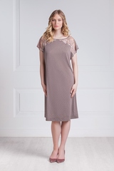 Очаровательная сорочка серо-коричневого цвета прямого кроя и удобной длины чуть ниже колена выполнена из легкой, смесовой ткани с хлопком, украшенной цветочным рисунком. Внимание привлекают эффектные вставки из полупрозрачного кружева с фантазийным узором, расположенные на коротких, цельнокроеных рукавах. Вырез-лодочка окантован атласной тканью в цвет основной ткани. Мягко ниспадающие рукава придают модели воздушность и романтическое настроение. Классический крой удачно смотрится на любой фигуре. Харакетристики: Длина рукава от плечевого шва или плеча (см) 26 Длина по спинке (см) 96 Степень плотности ткани Ткань тонкая Растяжимость ткани Хорошо тянется Вырез горловины Лодочка Состав: 50%хл, 50%микромодал