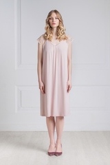 Очаровательная сорочка пастельного цвета пудры прямого кроя и удобной длины чуть ниже колена выполнена из легкой, эластичной вискозы высокого качества. Внимание привлекают эффектные, короткие рукава из полупрозрачного кружева с цветочным узором и ажурными краями. V-образный вырез горловины окантован атласной тканью в цвет основной ткани. Заложенная на груди складка – легкий акцент на красивой области декольте. Мягко ниспадающая ткань придает модели воздушность и романтическое настроение. Классический крой удачно смотрится на любой фигуре. Характеристики: Длина рукава от плечевого шва или плеча (см) 18 Длина по спинке (см) 105 Степень плотности ткани Ткань тонкая Растяжимость ткани Хорошо тянется Вырез горловины V-образный Состав: 95% вискоза, 5% эластан.