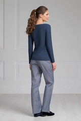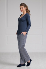 Стильный комплект с брюками выполнен из натуральных тканей в приятных тонах и состоит из двух деталей. Верх – топ облегающего силуэта с длинными рукавами, выполненный из легкой, приятной телу смесовой трикотажной ткани синего цвета меланж. Красивый V-образный вырез горловины украшен тонким кантом из ткани в полоску и небольшой вставкой. Низ – прямые брючки, выполненные из хлопчатобумажной ткани в тонкую бежево-синюю полоску. Брюки свободного кроя комфортной длины, дополненные по бокам удобными карманами. Характеристики: Длина рукава от плечевого шва или плеча (см) 68 Длина по спинке (см) 65 Тип карманов Прорезные Длина по внутреннему шву-брюки (шорты) (см) 80 Степень плотности ткани Ткань тонкая Растяжимость ткани Тянется слабо Вырез горловины Ассиметричный К-во карманов 2 Состав: Футболка: 95%вискоза, 5%эластан; брюки 100% хлопок