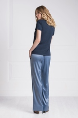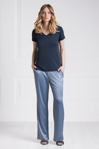 Легкая, комфортная пижама в приятных оттенках синего и голубого. Топ приталенного силуэта из вискозной ткани цвета синий меланж отделан атласной тканью вдоль V-образного выреза горловины и краев коротких рукавов. Длинные брючки выполнены из тонкой атласной ткани нежно-голубого цвета с геометрическим принтом. Модель брюк имеет прямой, свободный крой с боковыми прорезными карманами. Пояс на мягкой, широкой резинке. Пижама в приятной цветовой гамме придаст вашему образу особенный шарм и нежность. Состав: Футболка: 95%вискоза, 5%спандекс; брюки: 92% полиэстер, 8% спандекс.
