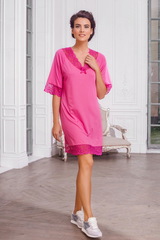 Женственная сорочка удобной длины чуть выше колена нежного розового цвета. Модель выполнена из 100% мягкой натуральной вискозы. Круглый вырез декольте украшен изящными полупрозрачные вставками из шикарного цветочного кружева с ажурными краями. Декольте украшает миниатюрный бантик из тонкой атласной ленточки. Сорочка свободного силуэта дарит больше комфорта и свободы. Рукава средней длины и подол сорочки так же декорированы тонким кружевом в тон модели. Красивая сорочка, изящная в своей простоте в сочетании с высоким качеством. Характеристики: Длина по спинке (см): 85 Степень плотности ткани: Ткань тонкая Растяжимость ткани: Хорошо тянется Состав: 100% вискоза