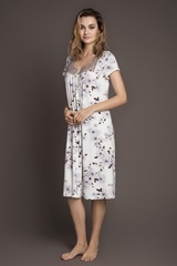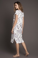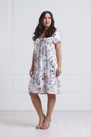 Красивая ночная сорочка слегка свободного силуэта и длиной ниже колен выполнена из мягкой, натуральной вискозы высокого качества с набивным цветочным принтом. Трапециевидный вырез горловины декорирован нежной кружевной вставкой дымчатого цвета с красивыми ажурными краями, придающими модели особую нежность. Область декольте также украшает бантик и пуговки. Оригинально заложенные складочки в районе груди позволяют модели красиво полуоблегать фигуру. Боковые разрезы обеспечивают Вам максимальный комфорт.
