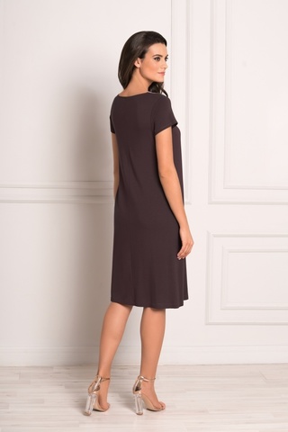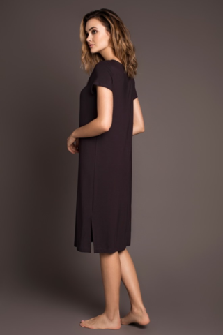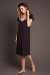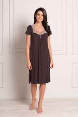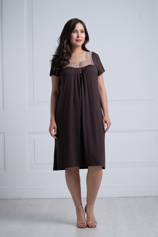 Красивая ночная сорочка слегка свободного силуэта и длиной ниже колен выполнена из мягкой, натуральной вискозы высокого качества насыщенного темно-коричневого цвета. Трапециевидный вырез горловины декорирован нежной кружевной вставкой дымчатого цвета с красивыми ажурными краями, придающими модели особую нежность. Область декольте также украшает ряд маленьких пуговок. Оригинально заложенные складочки в районе груди позволяют модели красиво полуоблегать фигуру. Боковые разрезы обеспечивают Вам максимальный комфорт. Характеристики: Длина рукава от плечевого шва или плеча (см): 14 Длина по спинке (см): 96 Степень плотности ткани: Ткань тонкая Растяжимость ткани: Тянется слабо Состав: микромодал 100%