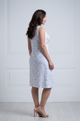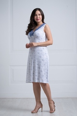 Женственная сорочка средней длины ниже колена выполнена из натуральной вискозы белого цвета с легким цветочным узором. Акцент модели – V-образный вырез, эффектно оформленный полупрозрачным ажурным кружевом яркого синего цвета с красивым рисунком. Отрезной лиф декорирован драпировкой в районе груди. Спинка модели закрытая. Модель слегка расклешенного силуэта выполнена из хорошо тянущейся ткани, мягко облегающей фигуру и красиво струящейся вниз. Нежный цветочный узор и сочетание цветов создают романтичное настроение. Характеристики: Длина по спинке (см): 94 Степень плотности ткани: Ткань тонкая Растяжимость ткани: Хорошо тянется Вырез горловины: V-образный Состав: микромодал (вискоза) 100%