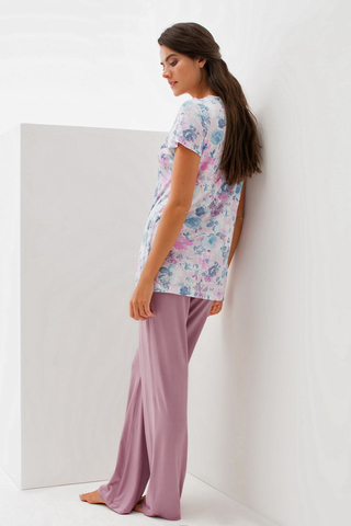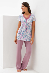Нежная, легкая пижама с брючками выполнена из 100% натуральной ткани (микромодала). Топ свободного силуэта с короткими рукавами выполнен из ткани белого цвета с нежным цветочным принтом. Область декольте украшена эффектной вставкой из кружева лилового цвета с красивой вышивкой. От декольте вниз заложена встречная складка, которая красиво моделирует силуэт в области груди и дарит модели еще больше комфорта и свободы. В комплекте свободные брючки прямого кроя из однотонной ткани с резинкой в поясе. Удобная и красивая модель высокого качества для комфортного отдыха. Характеристики: Длина по спинке (см) 68 Длина по внутреннему шву-брюки (шорты) (см) 80 Степень плотности ткани: Ткань легкая Растяжимость ткани: Хорошо тянется Состав: Топ: 100% микромодал; брюки: 94% микромодал, 6% эластан